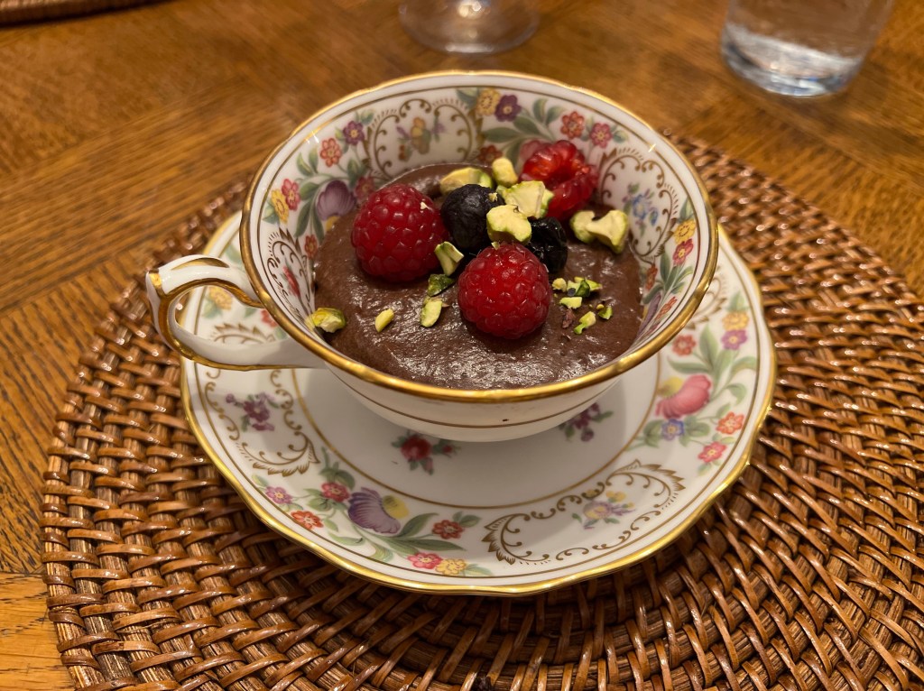 Chocolate mousse with raspberries and pistachios – Justine
